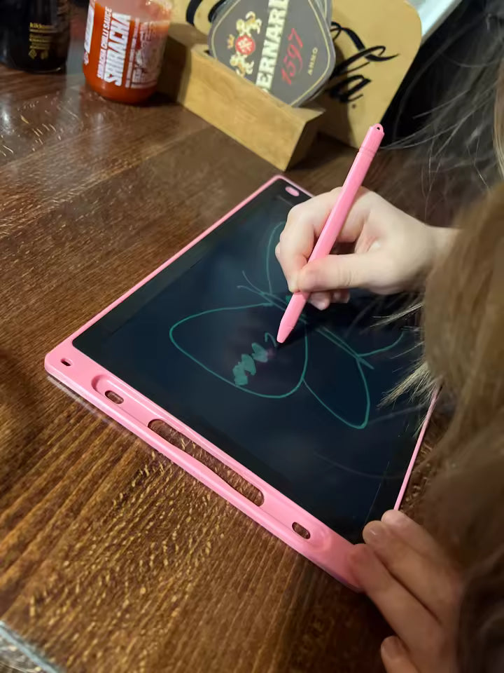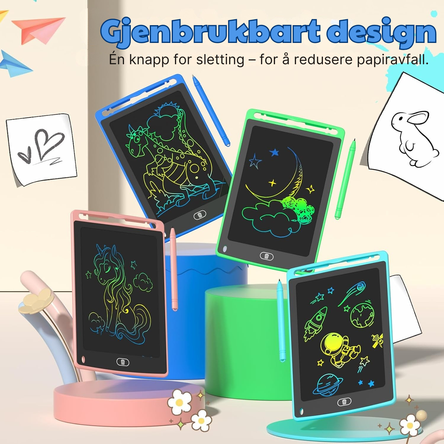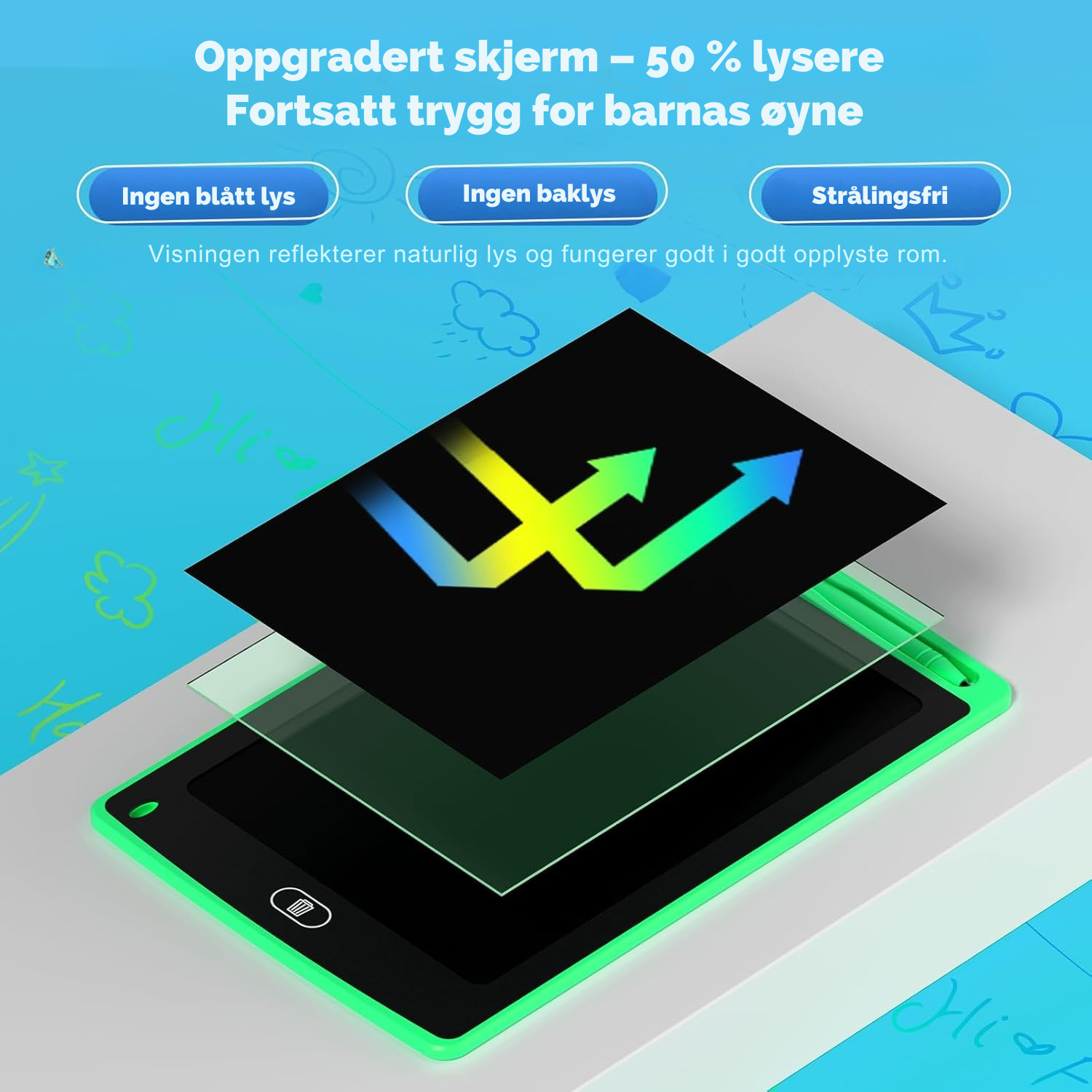 Tegnebrettet bruker trykkfølsom LCD-teknologi som lar deg tegne med den medfølgende pennen. Trykk én knapp for å slette alt og starte på nytt – helt uten blekk eller papir.